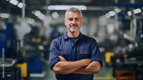 Smiling male factory worker standing with crossed arms, looking at camera.