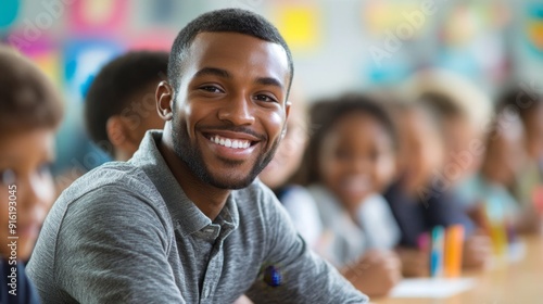 teacher, male, man, smiling, classroom, education, school, student, learning, happy, confident, black, african, american, diversity, young, adult, educational, lesson, cognition, instructor, teaching, mentor, guide, tutor, positive, hopeful, bright, future, career, profession, whiteboard, colourful, desk, chair, bookshelf, paper, book, supply, crayons, marker, school supplies