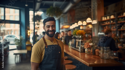smile, waiter, man, cafes, apron, customer service, hospitality, cheerful, urban, teamwork, lifestyle, young adult, friendly, cafes, happy, modern, indoor