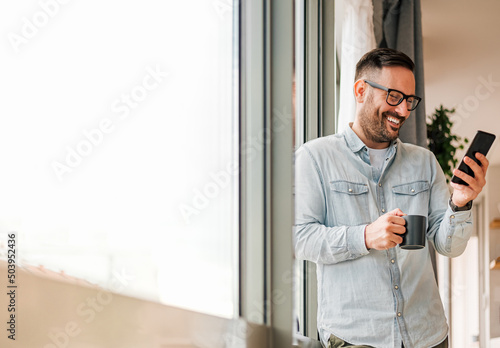 phone, business, happy, entrepreneur, people, smartphone, person, using, owner, professional, small, man, businessman, young, message, standing, text, e-business, cyberspace, modern, break, window, office, male, mobile, adult, confident, holding, positive, 1, lifestyle, looking, smiling, goggles, eyeglass, application, online, indoor, successful, male, texting, corporate, concept, hot drink, cup, relaxing
