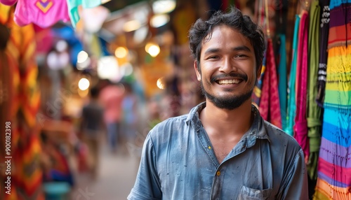 Smiling man in a casual shirt standing in front of a colorful market stall, radiating warmth and friendliness