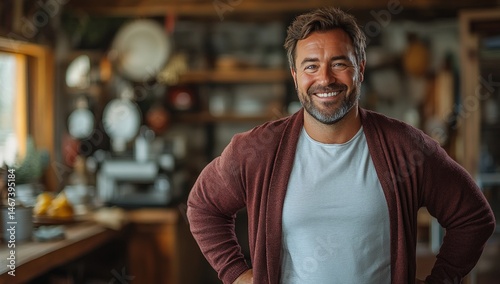 man, smile, happy, kitchen, home, interior, portrait, smiling, confident, friendly, positive, successful, casual attire, lifestyle, family, comfortable, cosy, warm, rustic, wooden, cabin, sharpened, portraiture, people, adult, male, caucasian, smiling face, photogenic, empathy, entrepreneur, owner, satisfaction, success, well-being, self-assured, healthy, content, appreciation, joyful, warmth, small business, modern