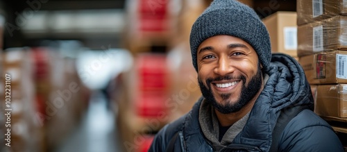 Smiling man in a warehouse.