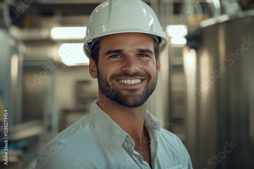 Smiling man in hard hat at factory. Ideal for construction, engineering, or industrial themes.