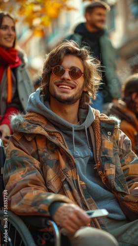 Smiling man in sunglasses and a camouflage jacket enjoys the outdoors in a wheelchair