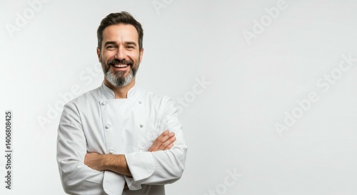 man, uniform, smiling, posing, confident, white, portrait, adult, male, professional, occupation, men at work, service, food industry, culinary, arms crossed, studio shot, indoor, head shot, background, plain, simple, clean, bright, happy, cheerful, positive, expression, facial expression, person, individual, beard, lifestyle, business, work, job, career, skill, expertise, cook, chef, food preparation, catering, eatery, hospitality, healthy, nourishment, cooking, meal