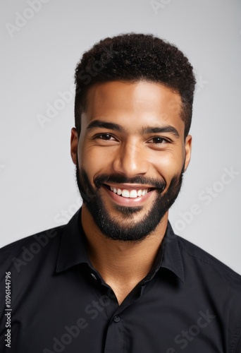 smiling man, portrait, short curly hair, beard, wearing black shirt, white background, studio lighting, realistic photography, casual pose