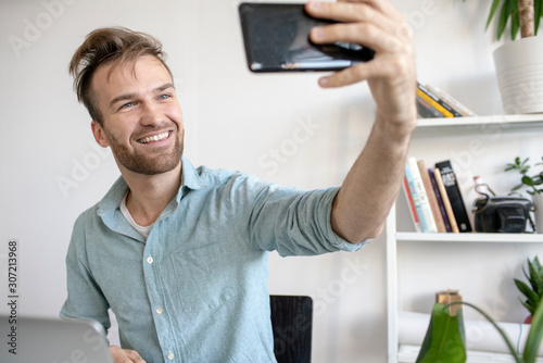 occupation, businessman, book, shirt, shelf, desk, laptop, mobile phone, working, photographing, smiling, sitting, joy, content, home, online, fun, connection, office, indoor, portrait, day, positive, technology, casual attire, business, independence, camera phone, accessibility, sharing, confidence, wireless, home office, wi-fi, freelancer, self-portrait, smartphone, selfie, one person, caucasian, blond, beard, job, businessperson