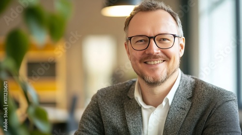 Smiling man wearing glasses works in office.