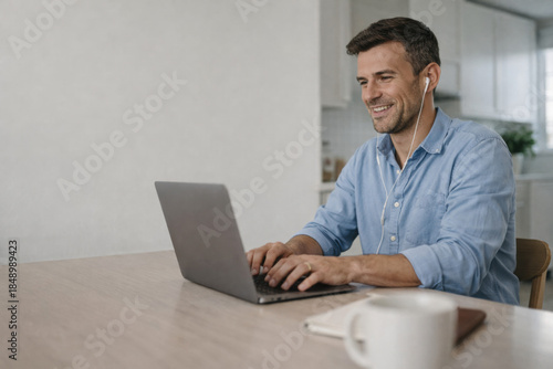 laptop, earbud, home office, man, smiling, productivity, business, technology, modern, workspace, professional, entrepreneur, freelancer, comfort, relaxed, focused, efficient, digital, online, communication, collaboration, innovation, creativity, success, happiness, computer, businessman, working, work, notebook, sitting, desk, cyberspace, person, smile, manager, photogenic, home, job, table