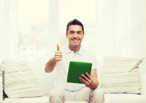 happy, man, home, tablet, thumb up, showing, networking, technology, social, cyberspace, reading, business, businessman, chatting, freelance, e-learning, distance, studying, learning, computer, lifestyle, online, middle, age, latin, hispanic, smiling, sofa, living, room, nice, leisure, free, time, male, people, app, application, contraption, connection, adult, communication, indoor, gesture, approve, approval, like, couch