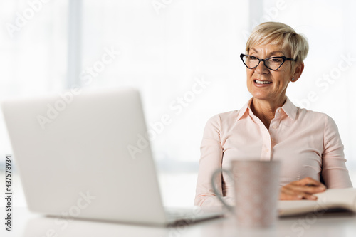 Smiling mature businesswoman working on laptop and taking notes in the office