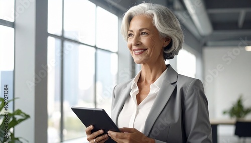Smiling mature female bank manager holding digital tablet in office. Happy older professional businesswoman, executive or entrepreneur standing with copy space background.