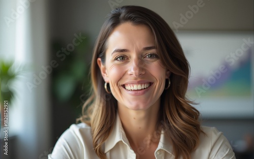 Smiling Mature HR Manager on Video Call in Office, Happy Business Woman in Remote Work Meeting, Professional Female Executive in Hybrid Conference, Digital Communication with Laptop. High quality
