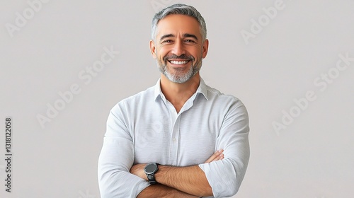 portrait, smiling, mature, man, standing, confidence, casual attire, attire, grey hair, beard, friendly, relaxed, professional, positive, expression, happiness, charisma, wellness, lifestyle, individual, adult, background, light, posing, arms crossed, male, happy, personable, stylish, face, closeup, outdoors, fashion, cheerful, approachable, natural, character, warm, candid, emotion, personality, connection, engagement, photo, studio