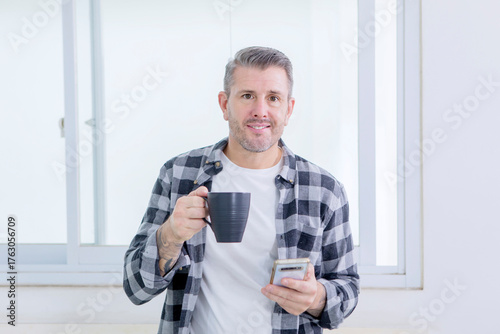 portrait, man, male, middle-aged, adult, casual attire, flannel shirt, plaid, hot drink, mug, drinking, smartphone, communication, technology, breakfast, home, indoor, modern, bright, natural light, window, grey hair, caucasian, smile, happy, cheerful, confident, relaxed, standing, holding, front view, lifestyle, well-being, apparel, tattoo, beverage, minimalist, telecommuting