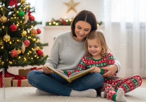 Smiling mother and daughter in pajamas reading a Christmas storybook together by a festive tree.