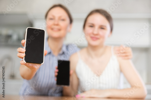 Smiling mother with adult daughter showing modern smart phone with blank screen, in the living room or in the kitchen