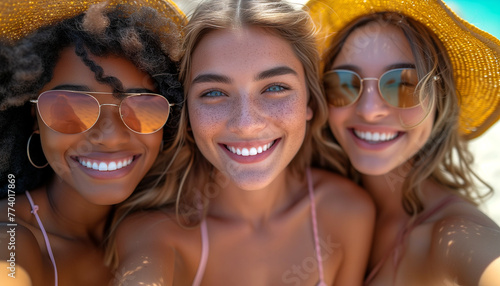 beach, woman, selfie, friends, smiling, posing, camera, phone, vacation, making, group, travel, holiday maker, summer, ocean, sea, happiness, bikini, girl, fun, people, holiday, lifestyle, family, blue, joy, three, friendship, smile, beauty, white teeth, together, sand, dentist, sunglasses, girlfriend, face, outdoors