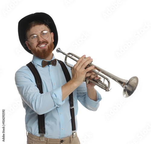 adult, art, artist, background, blowing, blues, brass, caucasian, classic, concert, entertainment, equipment, festival, guy, photogenic, happy, hat, hobby, instrument, isolated, jazz, lifestyle, male, man, melody, metal, music, musical, musician, occupation, orchestra, party, performance, performer, person, play, player, playing, portrait, professional, smiling, sound, style, symphony, talent, trumpet, trumpeter, white