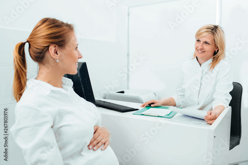 Smiling obstetrician talking with pregnant woman in clinic examination room. Consultation pregnancy