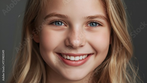 Smiling portrait of a young girl with long blonde hair and blue eyes against a neutral background displaying happiness and innocence