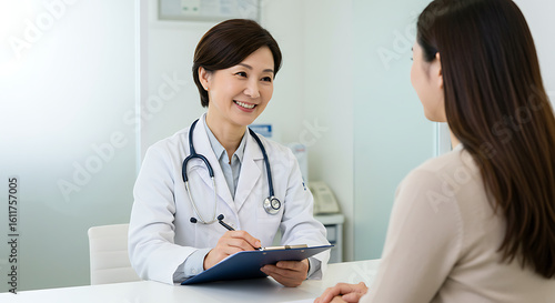 Smiling senior Asian female doctor in a white coat providing a friendly medical consultation to a patient in a clinic.