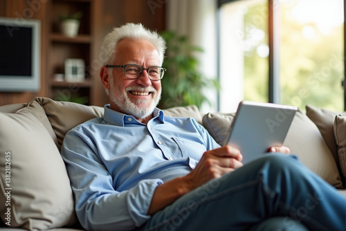 Smiling senior comfortably seated on a sofa at home, enjoying time using a digital tablet.