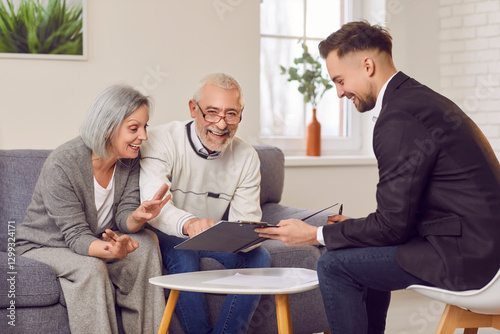Smiling senior couple finalizes purchase of new house with real estate agent. Signing contract senior couple buying property real estate in retirement help of real estate realtor Happy senior couple