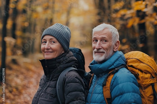 Smiling senior couple hiking in autumn