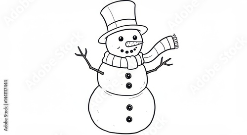 snowman, smiling, hat, foulard, black, white, line art, illustration, drawing, winter, holiday, christmas, festive, cheerful, happy, cartoon, simple, minimalist, design, graphic, element, vector, clip art, image, artwork, printable, colouring, page, winterly, snow, cold, cute, fun