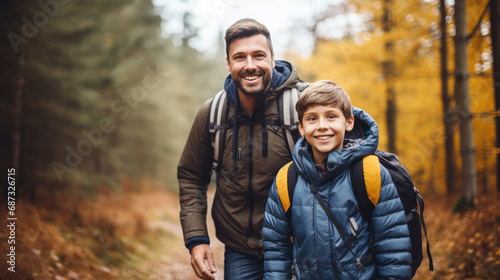 smiling son and father walking with backpacks through the forest, nature reserve, hiking, tall trees, blurred background, man, boy, trail, tourists, travel, hike, family, weekend together, child, kid