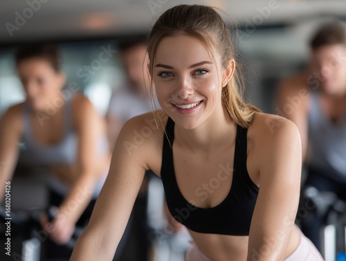 gym, spinning, fitness, sport, motivation, exercise, endurance, training, cycling, physical exercise, health, healthy lifestyle, wellness, cardio, indoor, class, group, smiling, happy, active, activewear, bike, sports bra, leggings, athletic, muscle, woman, strength, energy, body, beautiful, young, female, portrait, people, blurred background, equipment, lifestyle, recreation, leisure, fit, smile, club, exercising, healthy, running, athlete, beauty