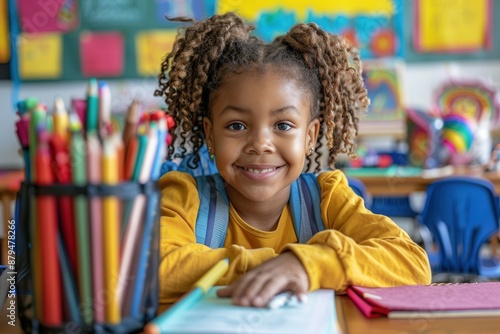 student, girl, smiling, happy, school, desk, supply, backpack, elementary, education, learning, classroom, childhood, development, pupil, young, children, african american, black, portrait, colourful, pen, back to school, kindergarten, preschool, elementary school, schoolgirl, cheerful, joyful, excited, motivated, book, notebook, writing, drawing, creativity, imagination, indoor, diverse, school supplies, studying, cognition, intelligence, academic