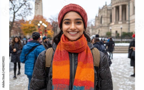 student, smiling, winter, campus, city, education, woman, girl, portrait, happy, young, autumn, fall, background, people, college, university, cheerful, outdoors, pretty, beautiful, urban, scene, snow, cold, weather, season, crowd, street, day, light, photo, image, photo, picture, model, fashion, lifestyle, travel, adventure, explore