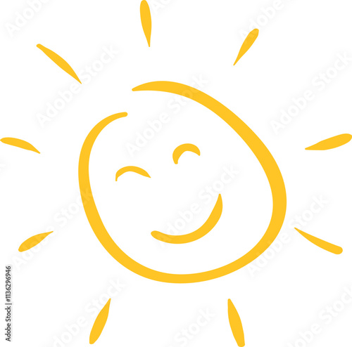 Smiling sun illustration with radiating lines, representing happiness, warmth, and positivity in a simple and playful cartoon style.