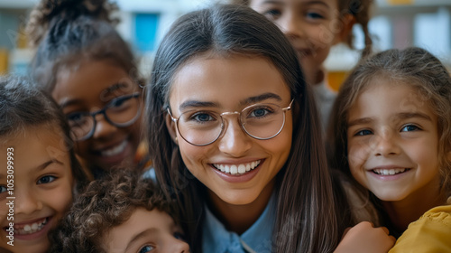 Smiling Teacher Embracing Group of Happy Students in Classroom