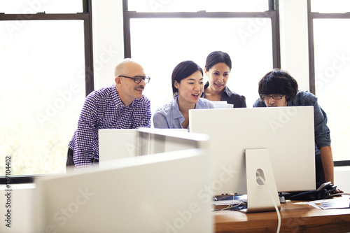 woman, man, office, computer, desk, horizontal, indoor, young adult, mature adult, young men, business, businessperson, office worker, four people, well-dressed, technology, connection, communication, looking away, standing, planning, holding, decision, businesswoman, businessman, strategy, cabinet, window, teamwork, cooperation, brainstorming, asian ethnicity, smiling, success, solution, computer monitor, us, new york city, new york city, inside, young adult, young people, young person, 20s, 20s, middle-aged, 30s, 30s, 40s, 40, 40s, female