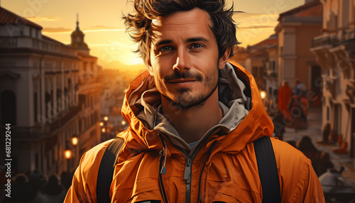Smiling tourist standing in city, enjoying winter sunset adventure generated by AI