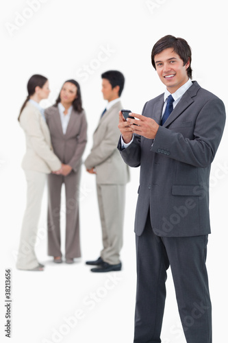 20s, 30s, business, businessman, businessperson, businesswoman, career, caucasian, mobile phone, mobile phone, cellular, communicate, communication, conversation, corporate, corporation, discussion, executive, holding, isolated, man, manager, message, mobile, modern, occupation, phone, portable, professional, smile, smiling, standing, suit, team, technology, phone, text, texting, three people, white background, woman, work, men at work, young