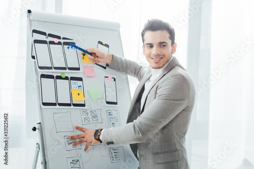 Smiling ux designer pointing with marker on website sketches and mobile templates on whiteboard in office