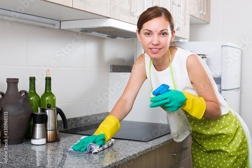 woman, female, cleaning, working, household, detergent, spray, glove, duster, cheerful, smiling, glad, home, apartment, apron, protective, washing, homemaker, interior, polishing, hygiene, holding, lifestyle, routine, equipment, occupation, service, caucasian, european, 30s, kitchen, house, maid, rubber, everyday, wet, portrait, homework, positive, flat, wiping, surface, neat, scrubbing, table
