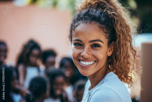 woman, smiling, happy, curly, hair, outdoors, portrait, volunteer, children, background, blurred, sharpened, closeup, cheerful, bright, teeth, healthy, skin, light, day, expression, positive, young, female, pretty, casual attire, joyful, girl, beautiful, optimistic