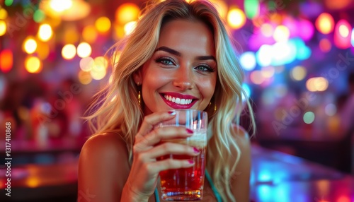 woman, young adult, caucasian, smiling, cocktail, bar, nightlife, celebration, joyful, happy, blonde hair, vibrant, casual attire, beverage, fun, party, socialising, gathering, lifestyle, night, cheerful, drinking, vivid colors, closeup, happy hour, entertainment, relaxation, friends, style, youthful, expressive, summer