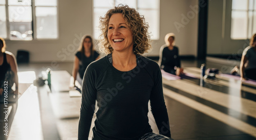 Smiling woman enjoying a yoga class in a bright fitness studio with natural light streaming through windows