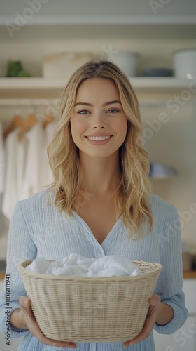 woman, laundry, basket, kitchen, clean, clothes, smiling, modern, home, household, chore, joyful, freshness, bright, clothing, happiness, domestic, life, interior, lifestyle, organisation, tidy, fabric, care, washing, everyday, girl, light, casual attire, relaxation, cheerful, routine, ambience, textile, womanhood, minimalist, soft, design, femininity, day, satisfaction, warmth, neat