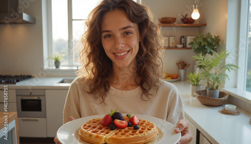 woman, waffle, berry, breakfast, smiling, happy, kitchen, brunch, food, plate, fruit, strawberry, blueberry, raspberry, homemade, celebration, delicious, tasty, festive, sirup, cheerful, cosy, casual attire, sunny, natural light, morning, home, cooking, sweet, pastry, warm, fresh, healthy, inviting, relaxing, holiday, light meal, culinary, joy, weekend, family, seasonal, refreshing, lifestyle, warmth