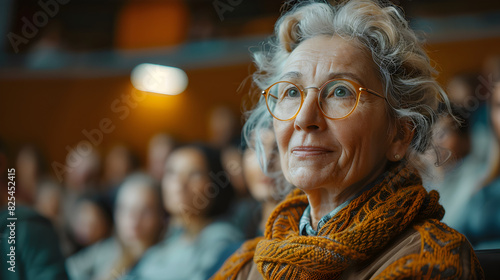audience, crowd, performance, theatre, art, culture, entertainment, music, concert, play, dance, musical, opera, ballet, symphony, orchestra, smiling, happy, joy, excitement, cheering, applause, appreciation, positive, emotion, elderly, woman, grey hair, foulard, brown, yellow, people, face, expression, light, stage, venue, indoor, night, blurry, background, photo, photo, image, picture, shot