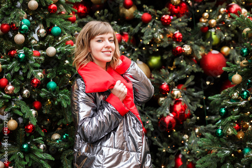 Smiling woman in silver and red down jacket among Christmas trees outdoors at Christmas fair.