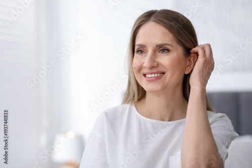 adult, age, aged, appearance, attractive, background, beautiful, beauty, calm, carefree, casual attire, caucasian, cheerful, confident, copy, elegant, face, fashion, female, hair, happy, health, healthy, home, house, independent, indoor, joy, lady, lifestyle, looking, mature, middle, modern, person, portrait, pretty, relaxed, serene, shirt, smart, smiling, space, style, stylish, text, well-being, wellness, white